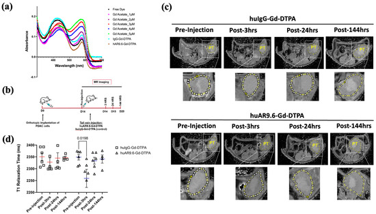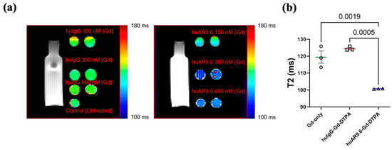 The pH of the conjugate with GdCl3 (formulated using the NaHCO3 and citrate buffers) was between 5 and 6. ICP-MS was conducted to determine the gadolinium concentration in the synthesized conjugates, and the Gd/Antibody ratio in huIgG–Gd–DTPA and huAR9.6–Gd–DTPA was found to be 54.81 and 22.61, respectively. Free Gd levels determined by xylenol orange assay for huIgG–Gd–DTPA and huAR9.6–Gd–DTPA were 0.28 µM and 0.29 µM, respectively, from 6360 µM of total Gd in the solution (Figure 1c). These amounts are negligible in terms of indicating any off-target or adverse effects, and measurement of this parameter is crucial when designing a non-toxic conjugate.