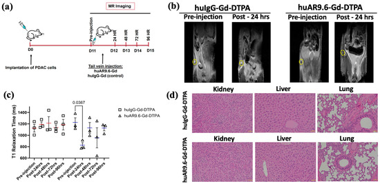Assessment of antibody MR conjugate in a subcutaneous model of PDAC. (a) Schema of MRI of subcutaneous pancreatic cancer model injected with T3 M4 cells (1 × 106 cells) at day 0 (D0), administered (intravenous, tail vein) with huAR9.6–Gd–DTPA or huIgG–Gd–DTPA (50 nM Gd/gram body weight) at 11 days post-tumor inoculation (n = 3/group) with MRI performed pre-injection and after 24, 48, 72 and 96 h; (b) T1 maps from in vivo subcutaneous tumor MRI of huIgG–Gd–DTPA and huAR9.6–Gd–DTPA groups treated pre-injection and post-24 h, subcutaneous tumors are circled in yellow; (c) the T1 relaxation time (milliseconds) of mice administered with huIgG–Gd–DTPA and huAR9.6–Gd–DTPA at various time points; (d) H&E staining of kidney, liver and lung tissues to assess morphological changes due to Gd toxicity (20× magnification). p < 0.05 is considered statistically significant.