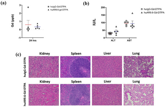 Biochemical and histopathological analyses were performed to determine potential Gd-induced toxicity to vital organs. ICP–MS conducted on serum collected 24 h post-conjugate administration revealed that there was no toxic accumulation of free Gd (<0.5 ppb) or Gd conjugates in the systemic circulation in the huAR9.6–Gd–DTPA group (Figure 5a). Liver enzymes ALT (alanine transaminase) and AST (aspartate transaminase) were in the normal range in both huAR9.6–Gd–DTPA and huIgG–Gd–DTPA groups (Figure 5b). Normal untreated mice had ALT and AST ranges of 25–60 IU/L and 50–100 IU/L, respectively [31]. ALT levels in huIgG–Gd–DTPA and huAR9.6–Gd–DTPA were 29.2 and 41.6, respectively, whereas the AST levels were 95.2, and histological assessment revealed no abnormal morphological changes in the kidneys, spleen, liver, or lung tissues from mice that received the huAR9.6 and huIgG conjugates (Figure 5c). These studies indicate that the huAR9.6–Gd–DTPA conjugate provides contrast enhancement for detecting orthotopic tumors within the pancreas in athymic nude mice and does not cause treatment-induced toxicity.