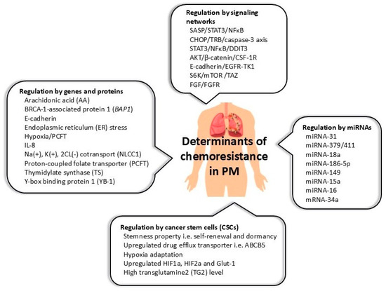 The mechanisms driving drug resistance, representing a crucial problem in PM therapy, are still largely undetermined. This review covers a description of potential determinants including the underlying mechanisms in ensuing treatment recalcitrance in this disease. A substantial body of evidence reveals a complex network of biological compounds and signaling pathways operating at the cellular and molecular levels. The identification of specific tumor resistance-associated proteins, genes, miRNAs, and downstream molecules of signaling circuits and the existence of cancer stem cells (Figure 1) offer promising treatment options for this malignancy, particularly in the development of new drugs in response to known mechanisms of drug resistance.