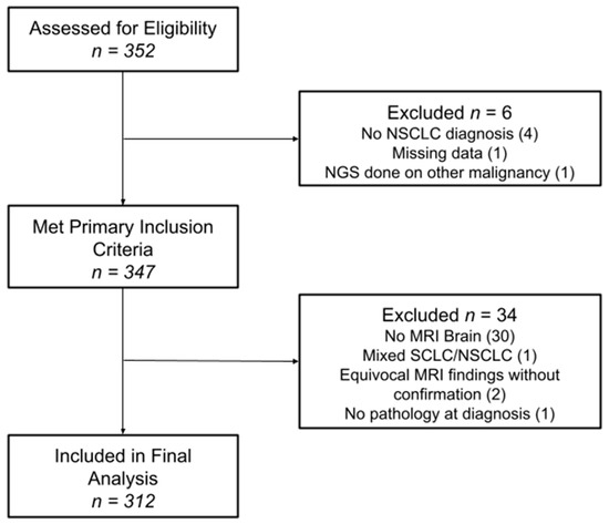 This study was conducted at Atrium Health Wake Forest Baptist, Winston-Salem, and was approved by the Wake Forest Health Sciences Institutional Review Board, IRB00033881. A prospective database is kept at our institution for all patients who undergo commercial comprehensive genomic profiling. This database was used to identify all patients diagnosed with NSCLC between 2005 and 2021, who also underwent genomic profiling using the Guardant 360 platform (n = 347). Patients who underwent genomic profiling through other platforms were excluded from the study, as were patients with a diagnosis of small-cell lung cancer. Patients without MRI brain (n = 30), with equivocal MRI brain findings without confirmation (n = 2), with mixed SCLC/NSCLC diagnosis (n = 1) and with missing pathology at diagnosis (n = 1) were excluded. Of note, institutional standard for acquiring genomic profiling during the timeframe of this study was for a new diagnosis of metastatic or locally advanced NSCLC. In the beginning of the study, when genomic profiling was earlier in its evolution, not every patient underwent genomic profiling; however, it became the standard of care at our institution by 2016. Electronic medical records were used to determine patient demographics at time of diagnosis, including age, sex, race and Karnofsky Performance Status (KPS), as well as clinical outcomes, including the development of BMs. All patient MRIs and clinical notes were reviewed both at staging and throughout their clinical course to determine whether patients developed BMs. Patients who never developed BMs were required to have a minimum follow-up of two years for study inclusion. Data collection ended on 1 February 2024.