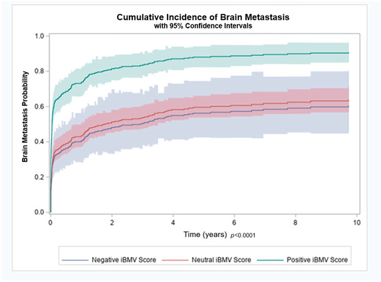 The identification of gene mutations of interest was carried out, as previously published by Abdulhaleem et al. [14]. First, a two-sample t-testing was used to identify gene mutations associated with iBMV. Since this first step was to screen all genes to identify any that had a potential signal, a higher p-value (<0.1) was used to identify potential genes for the signature. Next, each gene that was identified with a p < 0.1 was examined to see whether the presence (or absence) of the gene predicted a higher (or lower) iBMV. Based on this evaluation, a value of +1 was assigned to each mutation with a positive association with increased iBMV (“deleterious genes”), and a value of −1 to each mutation present with an inverse association (“protective genes”). The sum of these values was calculated to define iBMV risk scores of −1 (“negative iBMV”), 0 (“neutral iBMV”), with risk scores of 1, 2 and 3 pooled into a single group 1 (“positive iBMV”). A competing risk analysis using a Fine–Gray sub-distribution hazard model was then used to examine the time to brain metastases, while considering death as a competing risk. Cumulative incidence plots were created with corresponding 95% confidence intervals. Prior to fitting this model, we examined the proportional hazards assumption for time to brain metastases by examining Schoenfeld residuals [17]. In addition, a separate Cox proportional hazards model was fit, adjusting for patient’s age, disease stage and smoking status at time of diagnosis, to the impact on the iBMV risk score. Finally, we examined whether the iBMV risk score predicted overall mortality among patients using a Kaplan–Meier survival analysis and compared survival curves using the log rank statistic. Statistical analysis was performed using SAS version 9.4 (SAS Institute, Cary, NC, USA).