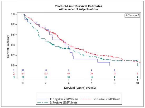 Overall survival by iBMV risk score is shown in Figure 3. OS at 1 and 2 years, respectively, for patients with positive, neutral and negative iBMV risk scores was 72% vs. 84% vs. 85% and 46% vs. 69% vs. 70% (p < 0.02). Median survival for patients with positive, neutral and negative iBMV risk scores was 1.95 years (95% CI 1.36–2.74), 3.34 years (95% CI 3.04–3.73) and 3.06 years (95% CI 1.44–4.09).