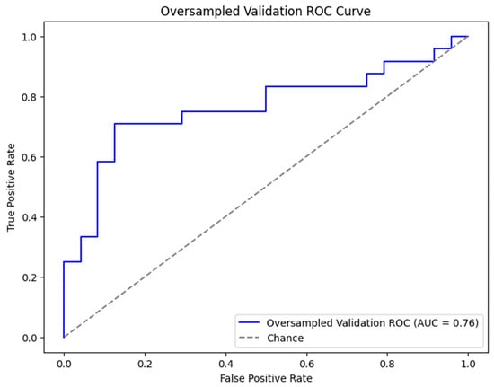 For the final model with oversampling in both the training-and-testing and validation phases, the complete dataset performed with 77.1% accuracy, 66.7% sensitivity, 87.5% specificity, and an AUC of 0.76 (Figure 1). The subset performance metrics were 64.6% accuracy, 58.3% sensitivity, 70.8% specificity, and an AUC of 0.75. The explainable AI for the final model is shown in Figure 2 and Figure 3.