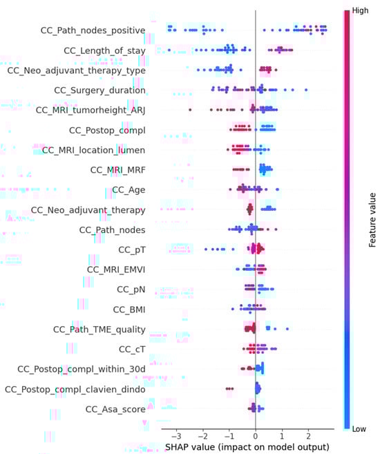 The use of ML models in this study represents a novel approach to identifying patients at risk of LR after rectal cancer surgery. Although the predictive performances of the models were modest, with AUC values ranging from 0.61 to 0.76, these results highlight the potential of ML to complement traditional clinical assessments. Predictive models could, with further validation and refinement, be used to enhance preoperative risk stratification, allowing for tailored surgical planning and postoperative care. For instance, patients identified as high-risk could benefit from more intensive follow-up protocols or adjunctive therapies to mitigate recurrence risks. Additionally, the explainability features of the ML models provide actionable insights into key predictive factors, supporting a data-driven approach to decision-making.