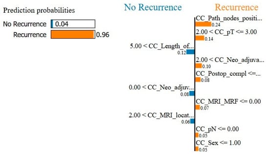Local Interpretable Model-Agnostic Explanations (LIME) is an explainable AI model for the local explanation of the XGB (eXtreme Gradient Boosting) prediction model. The left is the total prediction probability of the model, which should approximately correspond with the incidence of the output variable. The right shows an example of a random prediction and which variables contributed in which way to the model decision.