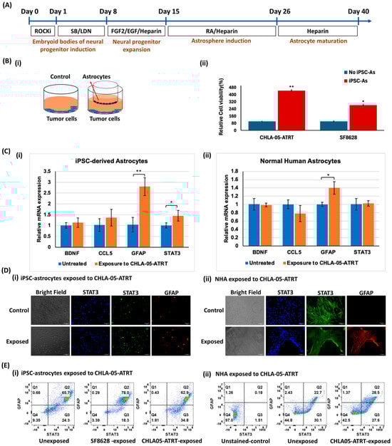 (A) Astrocyte differentiation from induced pluripotent stem cells (iPSCs). The schematic diagram shows the derivation of astrocytes from iPSCs. Rocki: rho-associated protein kinase inhibitor Y27632; FGF: fibroblast growth factor; EGF: epidermal growth factor; RA: retinoic acid. (B) Effect of iPSC-astrocytes on the proliferation of pediatric brain tumor cells. (i) The diagram represents the coculture system for the paracrine interaction of iPSC-astrocytes and tumor cells. (ii) The proliferation rates of DIPG and CHLA-05-ATRT cells increased significantly after coculture with astrocytes. (C) Effects of cancer cell exposure on (i) iPSC-astrocytes and (ii) normal human astrocytes (NHA). The relative mRNA expression of markers associated with the pro-inflammatory state of both iPSC-astrocytes and normal human astrocytes was measured after their exposure to tumor cells. The protein expression levels of STAT3 and GFAP shown in (D) fluorescent images and (E) flow cytometry data indicate higher percent expression in (i) iPSC-astrocytes and (ii) NHA upon coculture with cancer cells. GFAP: Glial fibrillary acidic protein, CCL5: c-c chemokine ligand 5, BDNF: Brain-derived neurotrophic factor. The Scale bar in (D) is 100 μm. The error bars represent the standard deviation in triplicate readings, and statistical significance is shown by * and ** for p-values less than 0.05 and 0.01, respectively.