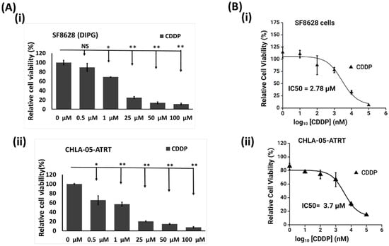 Relative viability study in ATRT and DIPG cells exposed to cisplatin at various concentrations. (A) Bar graphs indicate the percent cytotoxic effects of cisplatin (CDDP) on the viability of (i) SF8628 and (ii) CHLA-05-ATRT cells. (B) The dose–response curve of cisplatin indicating its cytotoxicity towards (i) SF8628 and (ii) CHLA-05-ATRT cells. The error bars represent triplicate readings, and statistical significance is shown by * and ** for p-values less than 0.05 and 0.01, respectively. NS: Not Significant. The inhibition dose–response curves are plotted and IC50 was calculated [] using Biorender.com.