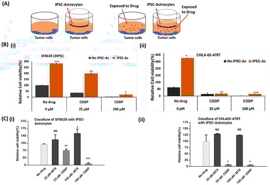 To investigate the effect of iPSC-astrocytes on the anti-tumor activity of cisplatin and methotrexate, an indirect coculture system was established (tumor cells/astrocytes = 2:1) (Figure 3A). This system was tested under four conditions: tumor cells only, tumor cells cocultured with astrocytes, tumor cells exposed to the drugs, and tumor cells exposed to the drugs within the coculture system (Figure 3A). Cisplatin and methotrexate were added to their respective culture conditions at final concentrations of 25 and 100 μM. The tumor cells were cultured in these conditions for 48 h before measuring their viability. The results indicated a significant increase in tumor cell growth in the presence of iPSC-astrocytes (Figure 3 and Supplementary Figure S7). The tumor cells exposed to drugs only showed a significant reduction in growth, especially the cisplatin-treated cells. However, tumor cells cocultured with astrocytes were less sensitive to these drugs. The results of SF8628 cell viability (Figure 3B(i) and Supplementary Figure S7B) suggest that their interaction with astrocytes developed resistance against drugs, lowering their sensitivity. At 100 µM, cisplatin lowered the percent viability of SF8628 (DIPG) cells to 4–10%. In contrast, in the cisplatin-astrocyte (CDDP-As) condition, the viability was 22% (Figure 3B(i)), implying the pro-tumorigenic effects of astrocytes. Compared to DIPG cells, CHLA-05-ATRT cells were more sensitive to the drugs in the coculture with astrocytes. Although astrocytes increased the viability of CHLA-05-ATRT cells under methotrexate treatment (Figure 3C(ii)), their growth-promoting effects in cisplatin-treated conditions were less pronounced (Figure 3B(ii),C(ii)).