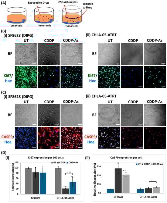Proliferation and apoptosis markers in pediatric brain tumor cells exposed to cisplatin and iPSC-astrocytes. (A) The diagram of the cell culture model was followed to set up all three culture conditions. The expression of (B) Ki-67 and (C) Caspase9 (Casp9) in (i) SF8628 (DIPG) and (ii) CHLA-05-ATRT cells exposed to untreated, cisplatin, and cisplatin–astrocyte treated conditions. (D) The expression of (i) Ki-67 per 100 cells and (ii) Casp9 per cell is quantified using ImageJ software. The images were captured with 200× magnification; the scale bar is 100 μm. Hoe: Hoechst 33342; BF: Brightfield; UT: untreated cell; CCDP-As: cells exposed to cisplatin and iPSC-astrocytes. The error bars represent triplicate readings, and statistical significance is shown by *, **, and *** for p-values less than 0.05, 0.01, and 0.001, respectively.