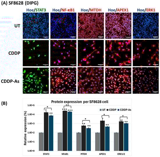 The increased expression of Caspase-9 (Figure 4D(ii)) and the decreased expression of Ki-67 (Figure 4B,D(i)) suggest that cisplatin exposure activated the apoptosis pathway in tumor cells. Although cisplatin-induced apoptosis and lowered tumor cell viability (Figure 2 and Figure 4), its cytotoxic efficacy was reduced in the presence of iPSC-astrocytes (Figure 3, Figure 5 and Figure 6), which may indicate the activation of potential cisplatin resistance pathways. To explore this further, cisplatin resistance markers, including NFκB1, APEX1, MTDH, ERK1, and STAT3, were investigated in tumor cells that survived cisplatin cytotoxicity (Figure 5, Figure 6 and Figure 7, Supplementary Figures S8–S10). The study conditions included untreated tumor cells (UT), cisplatin (CDDP)-treated cells, and tumor cells exposed to both cisplatin and astrocytes (CDDP-As) (Figure 4A).