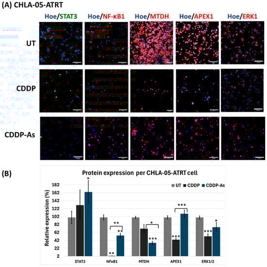 Markers involved in chemoresistance and tumorigenesis after exposure of CHLA-05-ATRT cells to various conditions of cisplatin and iPSC-astrocytes. (A) The immunofluorescent images show expression of STAT3, NFκB1, MTDH, APEX1, and ERK1 with the co-expression of Hoechst 33342 in CHLA-05-ATRT cells and (B) their quantification by measuring expression of signal intensity per cell using ImageJ. The images were captured with 200× magnification; the scale bar is 100 μm. Hoe: Hoechst 33342, STAT3: Signal transducer and activator of transcription 3, NFκB1: Nuclear factor-κB 1, APEX1: Apurinic/apyrimidinic endonuclease 1, ERK1: Extracellular signal-regulated kinase 1, MTDH: Metadherin. BF: Brightfield; UT: untreated cells; CCDP-As: cells exposed to cisplatin and iPSC-astrocytes. The error bars represent triplicate readings, and statistical significance is shown by *, **, and *** for p-values less than 0.05, 0.01, and 0.001, respectively.