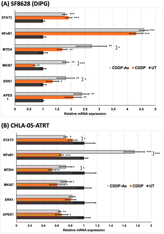 In the CDDP and CDDP-As-exposed CHLA-05-ATRT conditions, the expression of these markers per cell decreased (Figure 6B). However, STAT3 expression per cell increased in both treated conditions. To further understand the alterations in the signaling of these essential markers associated with cisplatin resistance pathways, their mRNA level changes were investigated (Figure 7).