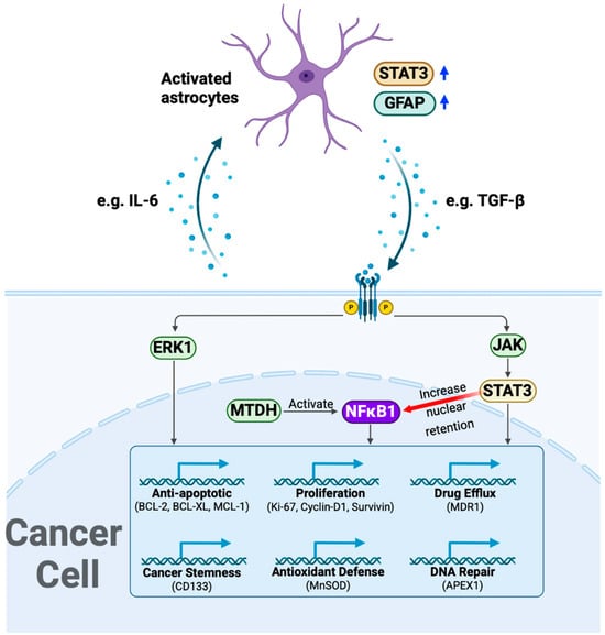 A schematic representation of cisplatin resistance mechanisms in pediatric brain tumor cells mediated by astrocytes. Tumor-derived chemokines (e.g., IL-6) activate brain-resident astrocytes, as indicated by the upregulation of STAT3 and GFAP. These primed astrocytes, in turn, promote tumor progression by secreting pro-tumorigenic factors such as TGF-β. Subsequent activation of ERK1, STAT3, and NFκB1 in tumor cells enhances cisplatin resistance through multiple mechanisms, including increased anti-apoptotic signaling, proliferation, drug efflux, cancer stemness, antioxidant defense, and DNA repair. Additionally, STAT3 facilitates NFκB1 nuclear retention, while MTDH, a positive regulator of NFκB1 and MEK/ERK signaling, further amplifies NFκB1 activation, collectively driving drug resistance. IL-6: interleukin-6, STAT3: signal transducer and activator of transcription 3, GFAP: Glial fibrillary acidic protein, TGF-β: transforming growth factor beta, NFκB1: Nuclear factor-κB 1, MTDH: Metadherin, ERK1: Extracellular signal-regulated kinase 1.
