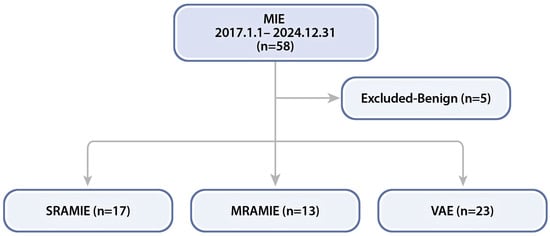 Flowchart of patients who underwent minimally invasive esophagectomy (MIE) at our center. MRAMIE, multi-port robot-assisted minimally invasive esophagectomy; SRAMIE, single-port robot-assisted minimally invasive esophagectomy; VAE, video-assisted thoracoscopic esophagectomy.