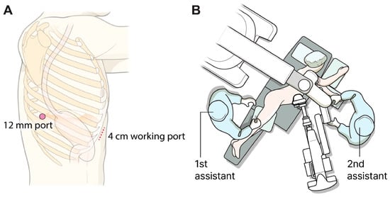 In the SRAMIE group, patients underwent single-port plus one port surgery using the SP robotic system while positioned in the lateral decubitus position. A single 4 cm incision was made along the subcostal margin, anterior to the 7th–9th ribs, and a 12 mm assistant port was created at the 8th intercostal space (ICS) along the posterior axillary line (Figure 2A). As previously described, a subcostal tunnel was created via a 4 cm incision [15]. A videoscope was inserted into the thoracic cavity through the 12 mm port with CO2 insufflation, facilitating safer and simpler visualization for creating the subcostal tunnel. An SP access port (Intuitive Surgical Inc., Sunnyvale, CA, USA) was installed at the working port and docked to the da Vinci SP patient cart. Subsequently, the first surgical assistant stood on the patient’s right side and inserted an assistant device through the 12 mm assistant port. Meanwhile, a second surgical assistant, positioned on the patient’s left side, inserted another device via the assistant port in the SP access port (Figure 2B).