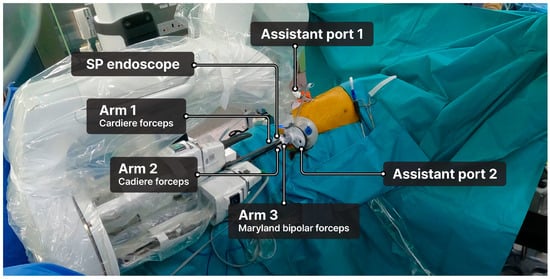 The SP endoscope was inserted into the central channel, and three robotic arms were installed: arm 1 (Cadiere forceps), arm 2 (Cadiere forceps), and arm 3 (Maryland bipolar forceps or monopolar curved scissors) (Figure 3). The SP system did not include a robotic stapler; therefore, when stapling was required, a surgical assistant inserted the stapler through the assistant port.