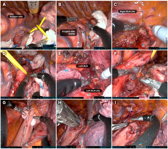 Step-by-step process of the thoracic phase during the Ivor–Lewis procedure. (A) Division of the azygos vein with an endostapler. (B) The divided azygos vein stump is typically sutured with the chest wall using an absorbable barbed suture (Monofix 4-0). (C) Dissection of the upper mediastinum and LNs along the upper thoracic esophagus. The right RLN LNs, as well as LNs from stations 2 and 4, are typically removed. (D) Dissection of the upper thoracic esophagus. The thoracic esophagus is encircled with a rubber band and elevated by the assistant. (E) Dissection of the left RLN LNs. (F) Dissection of the mid and lower thoracic esophagus, with removal of lymph node stations 7–10. (G) Gastric conduit is pulled up into the thoracic cavity. (H) Posterior wall anastomosis. Partial stapled anastomosis performed in an end-to-side fashion using a linear stapler. (I). Anterior wall anastomosis: a two-layer running suture is performed using an absorbable barbed suture (Monofix 4-0). LN, lymph node; RLN, recurrent laryngeal nerve.