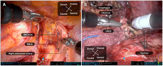 Dissection of the recurrent laryngeal nerve lymph nodes. (A) Right recurrent laryngeal nerve lymph nodes. (B) Left recurrent laryngeal nerve lymph nodes. LRLN, left recurrent laryngeal nerve; LN, lymph node; RRLN, right recurrent laryngeal nerve.