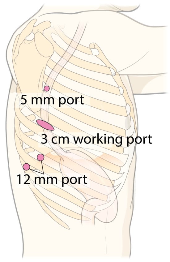 - Bagan, P.; Das-Neves-Pereira, J.C.; Abdesselam, A.B.; Couffinhal, J.C. Intercostal-subcostal combined complete port-accessed video-assisted lobectomy. Interdiscip. CardioVascular Thorac. Surg. 2010, 11, 383–384. [Google Scholar] [CrossRef] [PubMed]