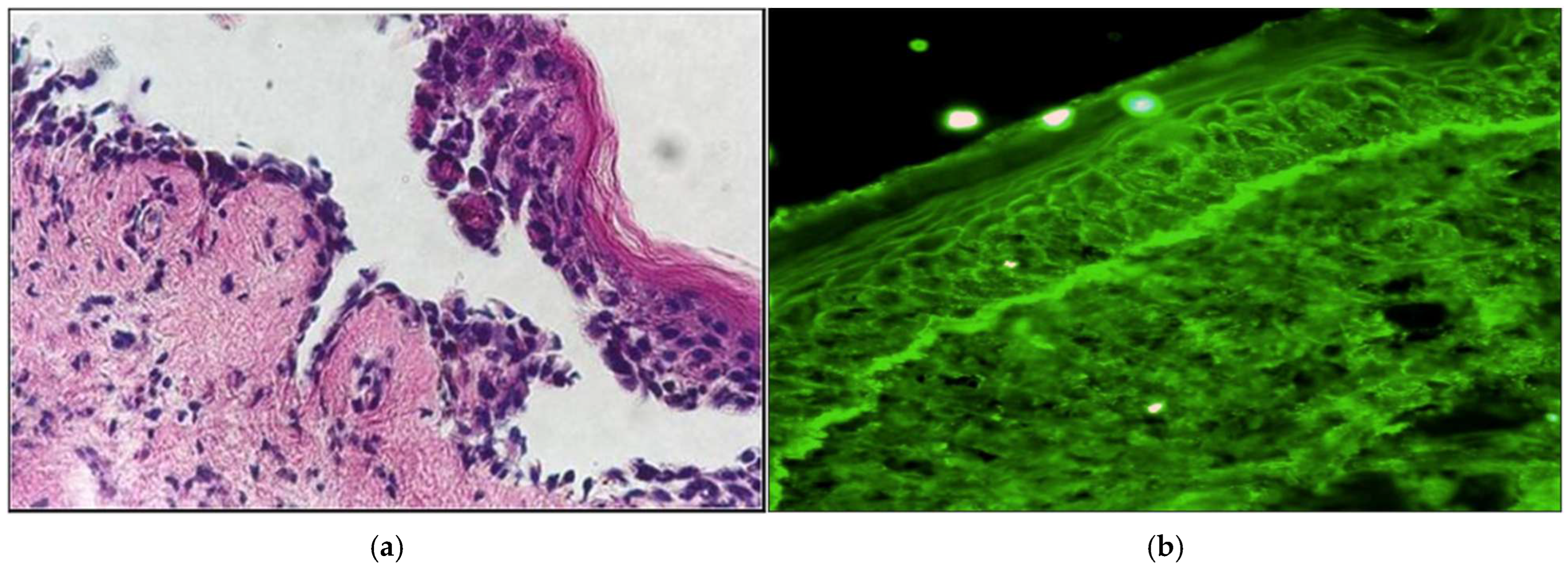 - Murrell, D.F.; Peña, S.; Joly, P.; Marinovic, B.; Hashimoto, T.; Diaz, L.A.; Sinha, A.A.; Payne, A.S.; Daneshpazhooh, M.; Eming, R.; et al. Diagnosis and management of pemphigus: Recommendations of an international panel of experts. J. Am. Acad. Dermatol. 2020, 82, 575–585.e1. [Google Scholar] [CrossRef] [PubMed] [PubMed Central]