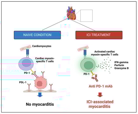 Diagram illustrating the development of ICI-associated myocarditis. Under naïve conditions, PD-1/PD-L1 interactions prevent T cell activation, avoiding myocarditis. With ICI treatment (anti-PD-1 mAb), cardiac myosin-specific T cells are activated, releasing IFN-γ, perforin, and granzyme B, leading to immune-mediated myocarditis.