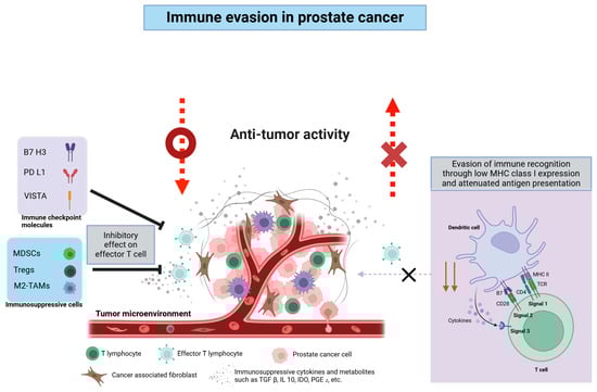 Immunosuppressive tumor microenvironment (TME) of prostate cancer. Schematic illustrating key immune evasion mechanisms in prostate cancer. Prostate cancer cells and cancer-associated fibroblasts release immunosuppressive factors (e.g., TGF-β, IL-10) and express immune checkpoints (e.g., PD-L1, B7-H3, VISTA), thereby suppressing effector T-cell function. MDSCs, Tregs, and M2-TAMs further weaken the antitumor response, while reduced MHC class I expression hampers tumor cell recognition by T cells. Abbreviations: B7-H3, B7 homolog 3; IL-10, interleukin-10; M2-TAM, M2-type tumor-associated macrophage; MDSC, myeloid-derived suppressor cell; MHC, major histocompatibility complex; PD-L1, programmed death ligand 1; TGF-β, transforming growth factor-beta; Treg, regulatory T cell; VISTA, V-domain Ig suppressor of T-cell activation. Created with BioRender.com.