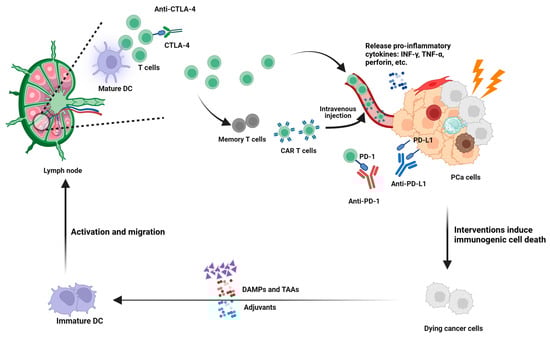Mechanisms of immune activation and targeted strategies in prostate cancer immunotherapy. Interventions (e.g., chemotherapy, radiotherapy, or oncolytic viruses) can induce immunogenic cell death in tumor cells, releasing damage-associated molecular patterns (DAMPs) and tumor-associated antigens (TAAs). These signals, often aided by adjuvants, activate immature dendritic cells (DCs), prompting their maturation and migration to regional lymph nodes. There, mature DCs present TAAs to T cells and help initiate robust antitumor responses, which are further amplified by checkpoint-blocking antibodies (e.g., anti-CTLA-4). The expanded population of tumor-specific T cells, including memory T cells, can be infused as chimeric antigen receptor (CAR) T cells or continue to circulate, infiltrating the prostate cancer (PCa) lesion. Once at the tumor site, T cells produce proinflammatory cytokines such as IFN-γ, TNF-α, and perforin, leading to cancer cell lysis. Meanwhile, therapies targeting the PD-1/PD-L1 axis counteract tumor-induced immunosuppression, augmenting T-cell cytotoxicity. Collectively, these strategies harness immune activation at multiple stages—antigen release, DC-mediated priming, T-cell expansion, and effector function—to optimize the eradication of prostate cancer cells. Created with BioRender.com.