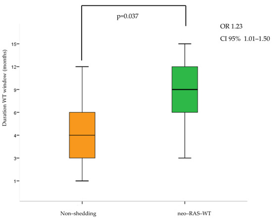 Finally, the neo-RAS population had a longer RAS-WT window compared to non-shedding (odds ratio [OR]: 1.23; 95% CI: 1.01–1.50; p = 0.037) (Figure 1).