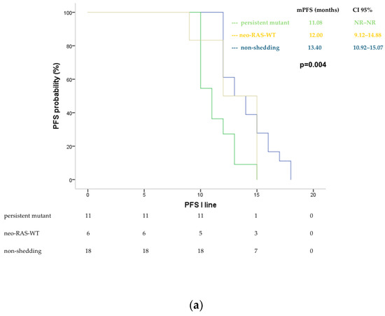In the third-line treatment, both neo-RAS-WT patients and non-shedding had an mPFS of 5 months (95% CI: NR for both), while persistent-RAS-mutant patients had an mPFS of 3 months (95% CI: 2.47–3.53); (p = 0.001) (Figure 4).