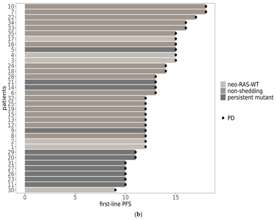 Progression-free survival (PFS) in neo-RAS-WT, non-shedding and persistent mutant patients in the course of first-line treatment illustrated in KM curves (a) and swimmer plot (b). PD = progression disease.