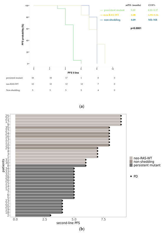 A similar trend was observed in patients receiving second-line treatment, where both neo-RAS-WT patients and non-shedding had an mPFS of 8 months (95% CI: 6.93–9.06 for neo-RAS; 95% CI: not reached for non-shedding). Persistent RAS-mutant patients had an mPFS of 5 months (95% CI: 4.82–5.17) (p < 0.0001) (Figure 3).
