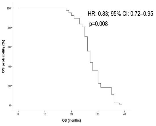 Furthermore, the duration of RAS-WT window was associated with longer overall survival (OS) in univariate analysis (HR: 0.90; 95% CI: 0.81–0.99; p = 0.04). This positive correlation was confirmed through multivariate analysis, adjusted by ctDNA status (neo-RAS WT vs. non-shedding), number of metastatic sites of disease and treatment line at the time of RAS conversion (HR: 0.83; 95% CI: 0.72–0.95; p = 0.008) (Figure 6).