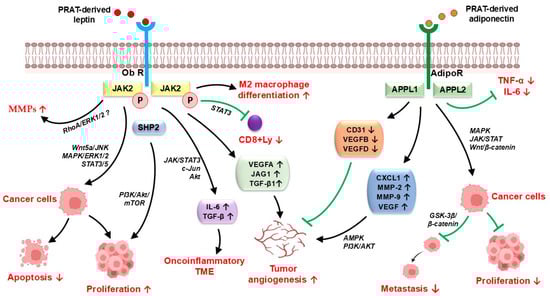 Potential mechanisms of PRAT-derived leptin and adiponectin in cancer progression and metastasis. PRAT-derived leptin binds to its receptor (Ob-R), promoting tumor growth and metastasis by JAK/STAT3, PI3K/Akt/mTOR, Wnt5a/JNK, and MAPK/ERK1/2 pathways, modulates the anti-tumor immune response by M2 macrophage differentiation, and is involved in extracellular matrix degradation via RhoA/ERK1/2 signaling stimulation. PRAT-derived adiponectin binds to its receptor (AdipoR), leading to the recruitment of APPL1 and APPL2, followed by the activation of several signaling pathways associated with anti-tumor effects and reduction of the tumor microenvironment inflammatory features by decreased expression of TNF-α and IL-6, but it also promotes tumor angiogenesis via AMPK and PI3K/AKT pathway activation. Adipo-R—adiponectin receptor; CD31—cluster differentiation 31; CXCL1—chemokine (C-X-C motif) ligand 1; IL-6—Interleukin 6; MMP—matrix metalloproteinase; Ob-R—leptin receptor; PRAT—perirenal adipose tissue; TME—tumor microenvironment; TNF-α—tumor necrosis factor α; VEGFA—vascular endothelial growth factor A; VEGFB—vascular endothelial growth factor B; ↑—increase; ↓—decrease; →—activation; ꓕ—inhibition.