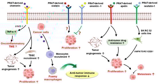 Considering this accumulated information, PRAT-derived adipokines may play a significant role in tumor cell growth and progression. However, the interplay between PRAT-derived adipokines and cancer is still only partly understood. As a result, future research is required to confirm the possible role of some PRAT-derived adipokines, such as apelin, omentin-1, and nesfatin-1, in cancer cell growth and tumor invasion.