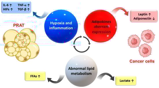 Potential mechanisms linking cancer to PRAT dysfunction in the tumor microenvironment. Aberrant adipokine expression and abnormal lipid metabolism, along with the increased hypoxic and inflammatory features of the tumor microenvironment, are the main mechanisms of tumor cell–PRAT interrelationship. FAAs—free fatty acids; HIFs—hypoxia-inducible factors; IL-6—Interleukin 6; PRAT—perirenal adipose tissue; TGF-β—transforming growth factor-β; TNF-α—tumor necrosis factor α; ↑—increase; ↓—decrease.