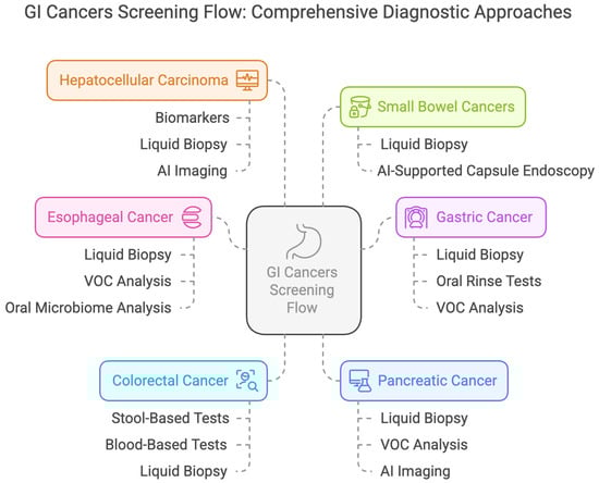 The early diagnosis of gastrointestinal cancers is essential for better survival and to reduce the burden of malignancies worldwide. However, screening methods such as endoscopy, colonoscopy, and imaging techniques, though effective, are usually invasive, expensive, and resource-consuming. These limitations, in turn, lead to low adherence, particularly in asymptomatic patients or in resource-poor settings, thus leading to late diagnosis and a poor prognosis. There is an increasing need for non-invasive or minimally invasive approaches that will improve early detection, patient compliance, and access to screening programs. Over the last years, technological development in cancer screening for GI malignancies has shifted toward the use of molecular biomarkers, AI-assisted imaging, and novel metabolic tests for more superficial stages [1,2,3,4,5,6,7,8,9,10]. Liquid biopsies, investigating circulating tumor DNA, miRNAs, exosomal markers, and other components that originate from tumor cells, have gained promising results in detecting gastrointestinal carcinomas. As promising as these times may seem, there are many issues to be overcome before non-invasive screening methods see wide acceptance in clinical use. Among these, the main issues to be considered are variabilities in sensitivity and specificity, large-scale validation studies, regulatory challenges, cost-effectiveness, and equity in health. Standardization of the biomarker panel across diverse populations is a critical step toward consistency in diagnostic precision. In addition, although AI-based diagnostics have very bright prospects, strong computational infrastructures, regulatory approvals, and clinician training will be required. Implementation will also be complicated by ethical considerations regarding genetic testing, data privacy, and incidental findings. Furthermore, thoughtful policy development and patient education will also be required. This review reflects on the recent progress that has been made for non-invasive screening of GI cancers, mainly with respect to their potential game-changing role for early cancer detection and the challenges still to be overcome on the path toward their broad clinical translation (Figure 1).