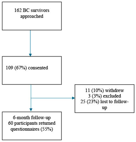 A total of 162 patients were approached to participate in the larger study from which these data are drawn, and 109 (67%) consented (see Figure 1). At the time of T2 follow-up, 70 (64%) participants were able to be contacted and 60 (86%) of them returned the study questionnaires. Of the participants who consented to the larger study, 11 (10%) had withdrawn from the study, 3 (3%) had been excluded, and 25 (23%) were lost to follow-up. No significant differences were found between the participants who returned questionnaires and those who did not in terms of their baseline pain (assessed immediately post-surgery), education, or employment status, or whether or not they underwent axillary node dissection. Significant differences were found between the two groups in terms of age (t = 1.020, p = 0.017), ethnicity (χ2(1) = 4.169, p = 0.041), and marital status (χ2(1) = 6.292, p = 0.012), such that the participants who returned questionnaires were older (59.8 ± 9.94 vs. 57.5 ± 12.83 years old), more likely to be White (85.0% vs. 77.9%), and more likely to be single (48.3% vs. 38.2%) than those who did not.