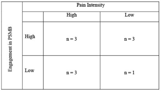 Distribution of qualitative participants based on purposive sampling. Note: pain intensity was measured using BPI Worst Pain and engagement in PSMBs was measured using the PSCBQ subscale ‘Total Number of PSMB’.
