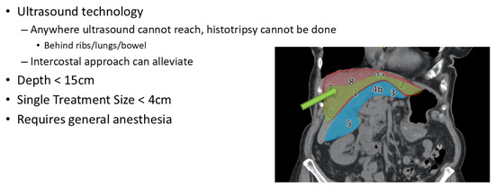Lesion targeting and the selection of anatomically favorable lesions are critical. Figure 2 includes an image-based guide for lesions that are typically favorable (green: Segments 1, 2, 4a, 6), those that are possibly favorable with advanced targeting experience (e.g., trans-costal approach: Seg 3, 4B, 5), and those that are less likely to be favorable with current ultrasound-based techniques (red: Seg 7, 8, some 4A).