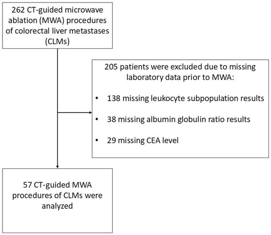 Between 2017 and 2022, 262 patients underwent a CLM ablation using MWA. However, out of the 262 patients who were treated, 57 patients had a complete blood count with defined leukocyte subpopulations, CEA value, and an albumin level tested prior to the procedure. Only data from patients who met these inclusion criteria were used for statistical analysis (Figure 1).