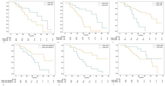 Kaplan–Meier curves in the different subgroups of patients based on the biomarkers levels: (a) platelet-to-lymphocyte ratio (PLR) level (cutoff: 122.7); (b) neutrophile-to-lymphocyte ratio (NLR) level (cutoff: 2.05); (c) lymphocyte-to-monocyte ratio (LMR) level (cutoff: 5.32); (d) carcinoembryonic antigen (CEA) density (cutoff: 0.00046 ng/mL·mm3); (e) CEA serum level (cutoff: 29.1 ng/mL); (f) albumin-to-globulin ratio (AGR) level (cutoff: 1.81).