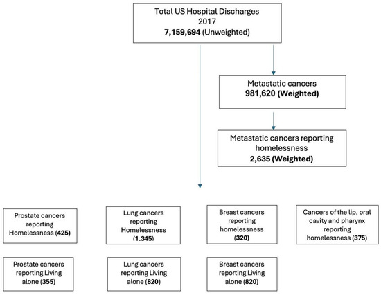 We used ICD-10-CM billing codes in our analysis for the following: types (PC, LC, and BC), key independent variables (homelessness [individuals without stable or dependable housing, attributable to poverty, insufficient affordable housing, mental illness, substance misuse, youth disconnection, or other circumstances (Figure 1). The ICD-10 code Z59.0 for homelessness is a medical classification designated by the WHO within the category of Factors Influencing Health Status and Contact with Health Services] and PrbLA [the ICD-10 code Z60.2 pertains to issues associated with living alone, classified by the WHO within the category of factors affecting health status and interactions with health services]), and outcomes of depression, anxiety, and illness burden (length of stay (LOS)). (In the supplementary file, ICD codes are included). Emergency services/admissions are provided in the dataset, and metastatic cancers are provided in the co-morbidity file obtained through the Elixhauser comorbidity index.