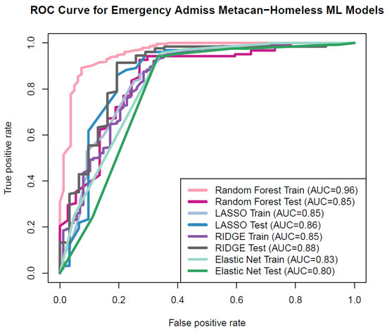 The primary predictors linked to emergency admissions in metastatic cancer patients experiencing homelessness include deficiency anemia, alcohol dependence, weekend admissions, blood loss anemia, and transfer status from other facilities. Along with these root nodes/variables of feature selection, we utilized race, payer status, median household income based on zip code, alcohol dependence, weight loss, and fluid and electrolyte imbalance. The prediction of emergency admission utilizing ML methods showed excellent prediction in the RF training model and RF testing model, as well as in the linear models of Lasso, ridge, and EN regression.