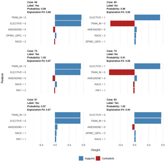 RF XAI-based explainability was constructed with 368 samples (unweighted), 12 predictors, and two classes of “No” and “Yes”. The confusion matrix and statistics showed the following: accuracy: 0.86, 95% CI: (0.79, 0.91), p-value [Acc > NIR]: 0.002, kappa: 0.58. And the explanation plot shows the cases from 66 to 83, with predicted root variables transferred in and elective admission along with race, median household income, payer status, and weekend admission. The predicted probability ranged from 0.86 (case 69) to 1.00 (case 83) with an explanation fit of 0.86 (case 69) to 0.99 (case 83) (Figure 3).
