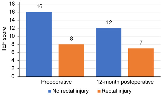 During further follow-up, one of the nine patients (11.1%) with a documented intraoperative RI following non-salvage RP underwent a diverting colostomy six months after RI repair. The colostomy was reversed after diagnostic confirmation of fistula closure. The patient had a pathological tumor stage of T3b, with LNM and PSM. Consequently, the patient was referred for RT three months after colostomy reversal. Unfortunately, an RUF developed in the third month following RT. Among RI patients, one had mild incontinence (11.1%), and one had severe incontinence (11.1%), but no significant difference was found between the groups 12 months after surgery (Table 4); on the other hand, IIEF-5 scores were lower at baseline (Figure 1), and there was a significant difference at 12 months postoperatively (Table 5).