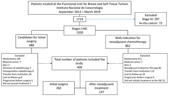 Between 1 September 2013 and 1 March 2019, 1719 patients were seen at the Functional Unit of the INC, and 78.5% (n = 1350) of these corresponded to stage I to IIIC patients. Of this group, 35.9% (n = 488) underwent initial surgery, and 64.1% (n = 862) received NACT. After a thorough review of clinical records, 409 patients met the inclusion criteria for the study. Figure 1 illustrates the causes of exclusion in the final analysis.