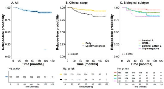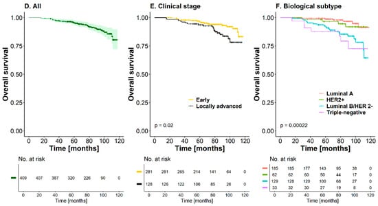 During the entire follow-up, a total of 38 deaths (9.2%) occurred; 27 of these patients had T2 tumors, half of them (n = 19) were node-positive, and 21 had luminal B HER2-negative tumors. At 60 months, the OS rate was 95.4% (CI95%: [93.3; 97.5]) for the entire cohort; the median OS was not reached for this cohort of patients (Figure 2D). The mortality rate was 1.39 deaths per 100 patient-years (CI95%: [0.98; 1.91]). Similar to the recurrence-free time outcome, a statistically significant difference was found between curves according to the clinical stage and biological subtype, with a worse prognosis in patients with locally advanced tumors (HR = 2.09, CI95%: [1.11; 3.92], p-value = 0.023) and with triple-negative biological subtypes (HR = 6.13, CI95%: [2.05; 18.3], p-value < 0.01) (Figure 2E,F). For this outcome, the adjusted analysis showed that a locally advanced clinical stage (HR = 5.13, CI95%: [1.49; 17.6], p-value < 0.01), triple-negative subtype (HR = 8.02, CI95%: [1.79; 35.9], p-value < 0.01), and nodal involvement greater than four lymph nodes in the surgical specimen (HR = 4.00, CI95%: [1.44; 11.3], p-value < 0.01) were statistically significant factors that determined a worse prognosis in this cohort of patients with OS. The primary treatment did not have an important effect on this outcome (HR = 1.22, CI95%: [0.36; 4.18], p-value = 0.750) when adjusted for the other covariates (Table 4).