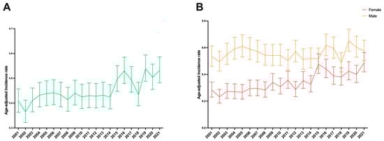 To account for data variability and uncertainty in statistical modeling, each age-adjusted incidence rate estimate in the study was presented with a corresponding 95% confidence interval (CI). Additionally, the annual percent change (APC) in age-adjusted incidence rates from 2001 to 2021 was calculated, along with 95% CIs, to evaluate temporal trends. An APC with a positive value and p < 0.05 was interpreted as an upward trend, while a negative APC with p < 0.05 indicated a downward trend. Changes with p ≥ 0.05 were considered statistically insignificant. The analysis was conducted using the Joinpoint Regression Program (version 4.9.1.0) developed by the National Cancer Institute.