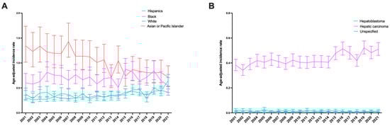 Age-adjusted incidence rate per 100,000 of early-onset liver and intrahepatic bile duct cancer from 2001 to 2021 in the United States (A) by ethnicity and (B) by histological type.